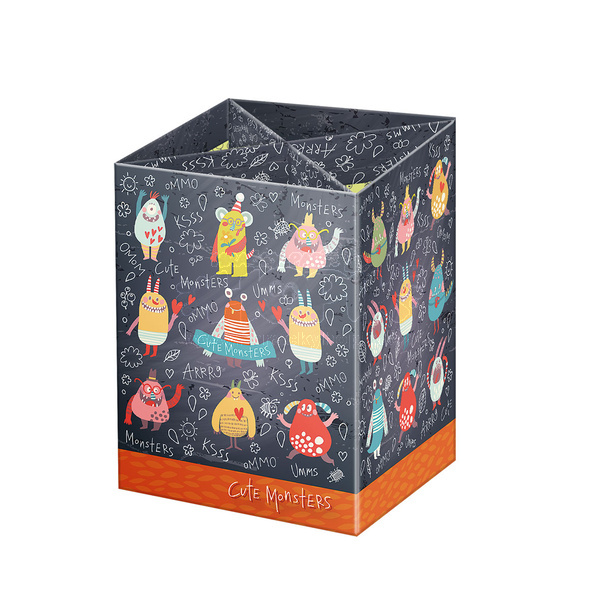 Hezký stojánek na psací potřeby s atraktivním motivem příšerek Cute Monsters. Stojánek je rozdělený na čtyři trojúhelníkové části a je vyrobený z pevného kartonu. Detailní informace
