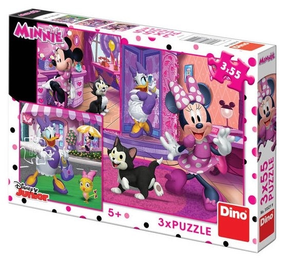Kvalitní puzzle od firmy Dino s oblíbenou myškou Minnie. Balení obsahuje 3 x 55 dílků kvalitních puzzle pro děti od 5 let. Každý dílek má svůj nezaměnitelný tvar. Dílky jsou velmi pevné a přesně do sebe zapadají. Skládání puzzle procvičuje prostorovou orientaci, pamět a myšlení. Puzzle bylo vyrobeno v ČR z kvalitní a zdravotně nezávadné lepenky.