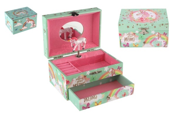 Hrací skříňka šperkovnice Jednorožec natahovací v krabičce 16x10x12cm