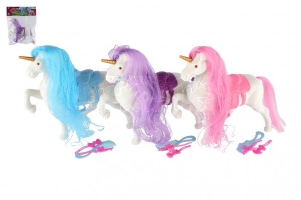 Jednorožec/kůň česací plast se sedlem s doplňky 3 barvy v sáčku 21x25x6cm