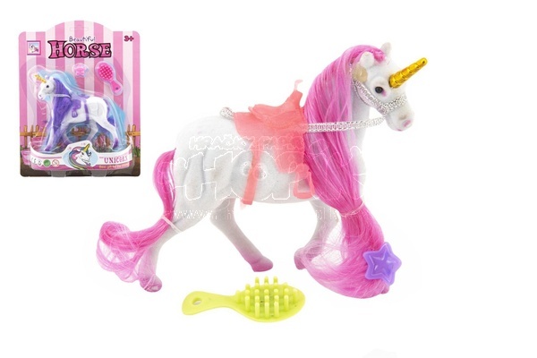 Jednorožec/kůň fliška 15cm česací se sedlem s doplňky 2 barvy na kartě