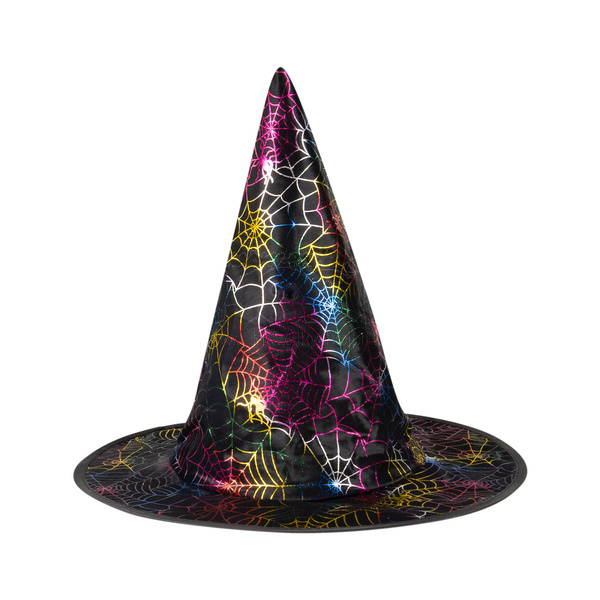 Kouzelný klobouk černé barvy zdoben barevnými magickými pavučinami. Tento klobouk je určen pro dospělé a je ideální na čarodějnickou nebo halloweenskou oslavu.