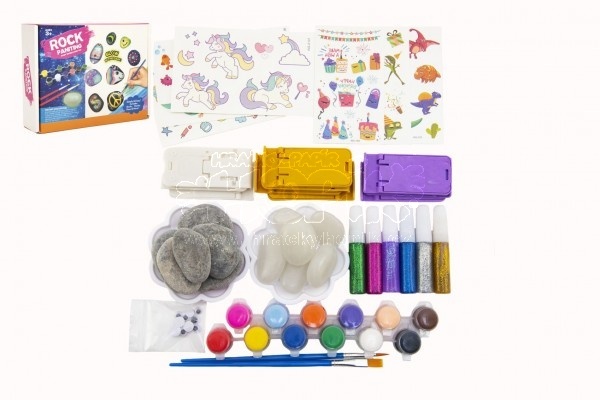 Zábavné zdobení malování kamenů nebo oblázků, které zabaví najen děti, ale i dospělé. Pokud kamínky z balení dojdou v přírodě jich na vás čeká dost. Vynikající hračka pro rozvoj manuální zručnosti, to je malování na kameny a oblázky. Vše potřebné k výrobě najdete uvnitř balení. Balení obsahuje: 12 kamenů (z toho 6 svítících), 6x glitrové lepidlo, 12x barvy v uzavíratelných kelímkách, samolepky, palety na míchání barev, štětce, pohyblivé oči, stojánky pro malování kamenů. Rozměry balení 20 x 15 x 5 cm. Vhodné pro děti od 3 let. Detailní informace