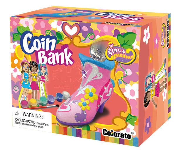Kasička na penízky ve tvaru střevíčku, který si každý může namalovat podle sebe! Do této tebou ozdobené pokladičky se bude spořit samo! Balení obsahuje: pokladničku, barvy, kamínky, štětec, paletku a lepidlo. Návod: 1. Namaluj si pokladničku dle své fantazie. 2. Nech barvu zachnout. 3. Nalep kamínky, lepidlo můžeš použít i k samostatné dekoraci. 4. Už ti nic nebrání v šetření! Rozměr balení: 17 x 14 x 11 cm Vhodné pro děti od 3 letParametry Kreativní sada Pokladnička k vymalování střevíček s doplňky
