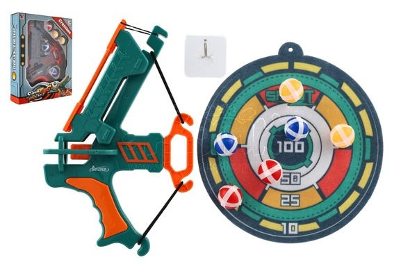 Luk 33cm vystřelující míčky na suchý zip 6ks plast + terč 2 barvy v krabici 27x35x7cm