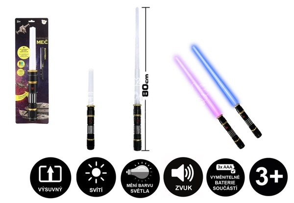 Parametry Meč svítící vesmírný skládací plast 80cm na baterie se světlem se zvukem na kartě 16x51x5cm