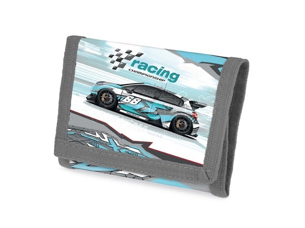 Dětská textilní peněženka s motivem auta. Peněženka má přihrádku na bankovky, mince, kapsičku vhodnou například na jízdenky a také kapsičku s průhledným okýnkem o velikosti kreditní karty. Peněženka má kovový kroužek na zavěšení. Detailní informace