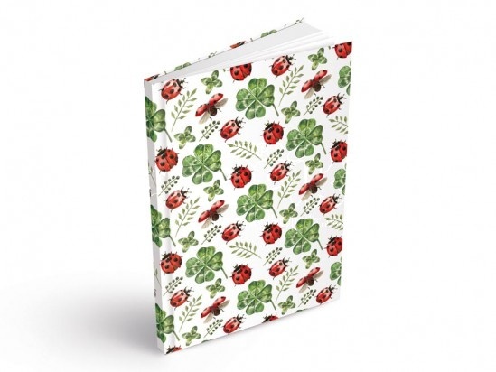 Záznamní kniha - blok s hezkým motivem čtyřlístků a berušek, linkovaná v pevných deskách ve formátu A5. Desky jsou z pevného lepeného kartonu s laminem. Detailní informace