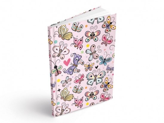 Záznamní kniha - blok s oblíbeným motivem motýlů, linkovaná v pevných deskách ve formátu A6. Desky jsou z pevného lepeného kartonu s laminem. Detailní informace