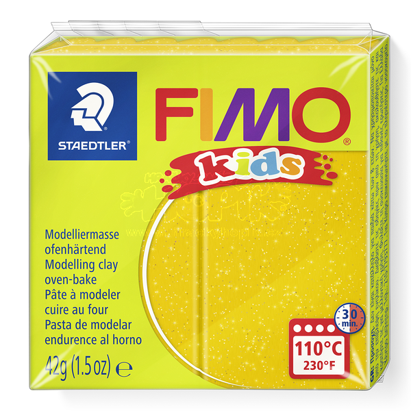 FIMO kids zlatá se třpytkami je modelovací hmota, která se vytvrzuje pečením v troubě a která byla vyvinuta speciálně pro dětské ruce. FIMO kids podporuje v dětech kreativitu a představivost tím, že jim umožňuje vytvářet si svoje vlastní hračky. Fimo hmota má CE certifikát a splňuje směrnice EU o bezpečnosti hraček. Detailní informace