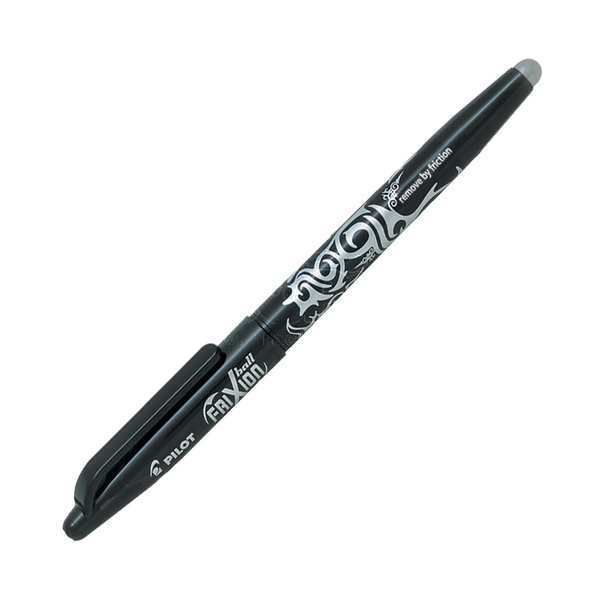 Pilot Frixion černý. Provedení s víčkem. Pilot Frixion je přepisovatelný, gumovatelný - napsaný text lze vymazat a znovu přepsat na tomtéž místě tolikrát, kolikrát chcete, text vygumujete třením plastového zakončení rolleru na papíře. Pero má výměnnou náplň a je dostupné v mnoha barevných provedeních, pera píší podle barvy těla. Gumovací pero Pilot FriXion pro všechny.