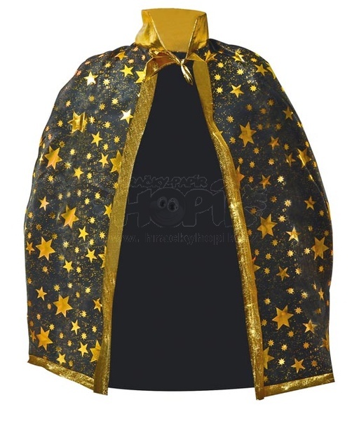 Čarodějnický plášť se zlatými hvězdami. Karnevalový plášť využijete ke kostýmu černokněžníka, kouzelníka. V černozlaté kombinaci barev budete nepřehlédnutelní. Je z lehké látky a váže se pomocí šňůrek.