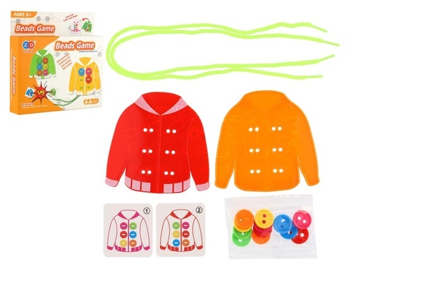 Přišívání knoflíků/proplétání provázků plast edukační hra v krabičce 16x16x3cm