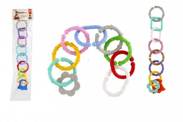 Plastový řetěz s různými tvary pro nejmenší děti. Řetěz je tvořen 8 dílky různých geometrických tvarů. Každý dílek má velikost cca 6cm. Z jednotivých částí je možné vytvořit krásný, různě dlouhý řetěz, přesně podle Vašich představ. Pestrobarevná hračka miminko okamžitě zaujme a zabaví na dlouhou dobu. Detailní informace