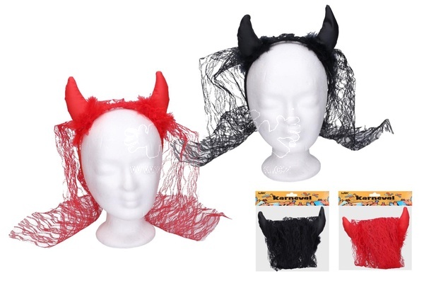 Detailní popis Rohy čertovské se závojem čelenka látka/plast 2 barvy v sáčku 22x25cm karneval