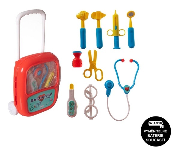 Detailní popis Sada doktor/lékař plast se stetoskopem na baterie v plastovém kufříku na kolečkách 24x33x10cm