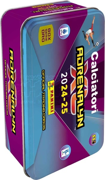 Sběratelské karty SERIE A 2024/2025. V plechové krabičče je celkem 45 karet: 16 základních + 19 speciálních + 6 exkluzivních + 4 limitované.Parametry SERIE A 2024/2025 - ADRENALYN karty - plechová krabička (hranatá)