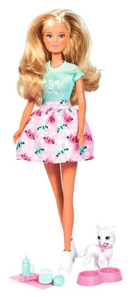 Hezká panenka Steffi v moderním oblečení s kočičími motivy s koťátkem. Steffi se stará o koťátko, krmí je a když má po krmení špinavou tlamičku, očistí mu ji přibaleným hadříkem namočeným v teplé vodě (flíčky reagují na teplotu a při teplotě cca 31° C zmizí). V příslušenství nechybí ozdobný obojek, misky na krmení, lahvička na pití, kartáč a hračky pro koťátko. Velikost panenky 29 cm.