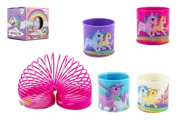 Detailní popis Spirála/ pružina jednorožec plast průměr 6,5cm 4 barvy v krabičce 7x7x7cm