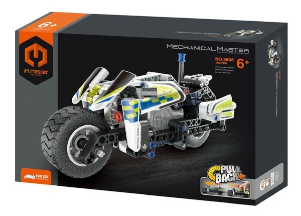 Detailní popis Stavebnice iM.MASTER policejní motorka na zpětné natažení plast 193 dílků v krabici 29x20x6cm