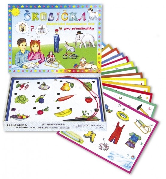 Školička je elektrická kombinační hra pro děti od 4 let. Obsahuje 16 listů se 176 obrázky, mezi nimiž děti hledají souvislosti. Každý list je zaměřen na určitou oblast dětského světa. Hra pomáhá rozšiřovat vědomosti, vyžaduje postřeh, nutí děti všímat si vztahů mezi předměty, porovnávat je podle určitých vlastností a přiřazovat předměty k sobě, bez nutnosti umět číst, neboť listy neobsahují žádné texty.Při správné odpovědi se rozsvítí zelené světélko. Hračka je na baterie, nejsou součástí výrobku.